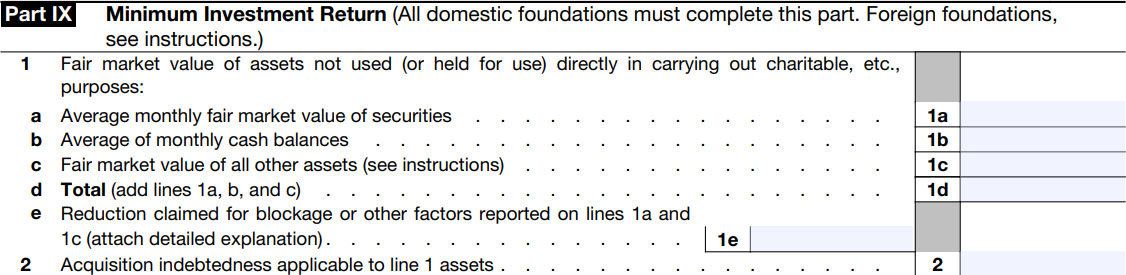 - Using the above information, the net value of noncharitable-use assets and minimum investment return can be derived and reported.
